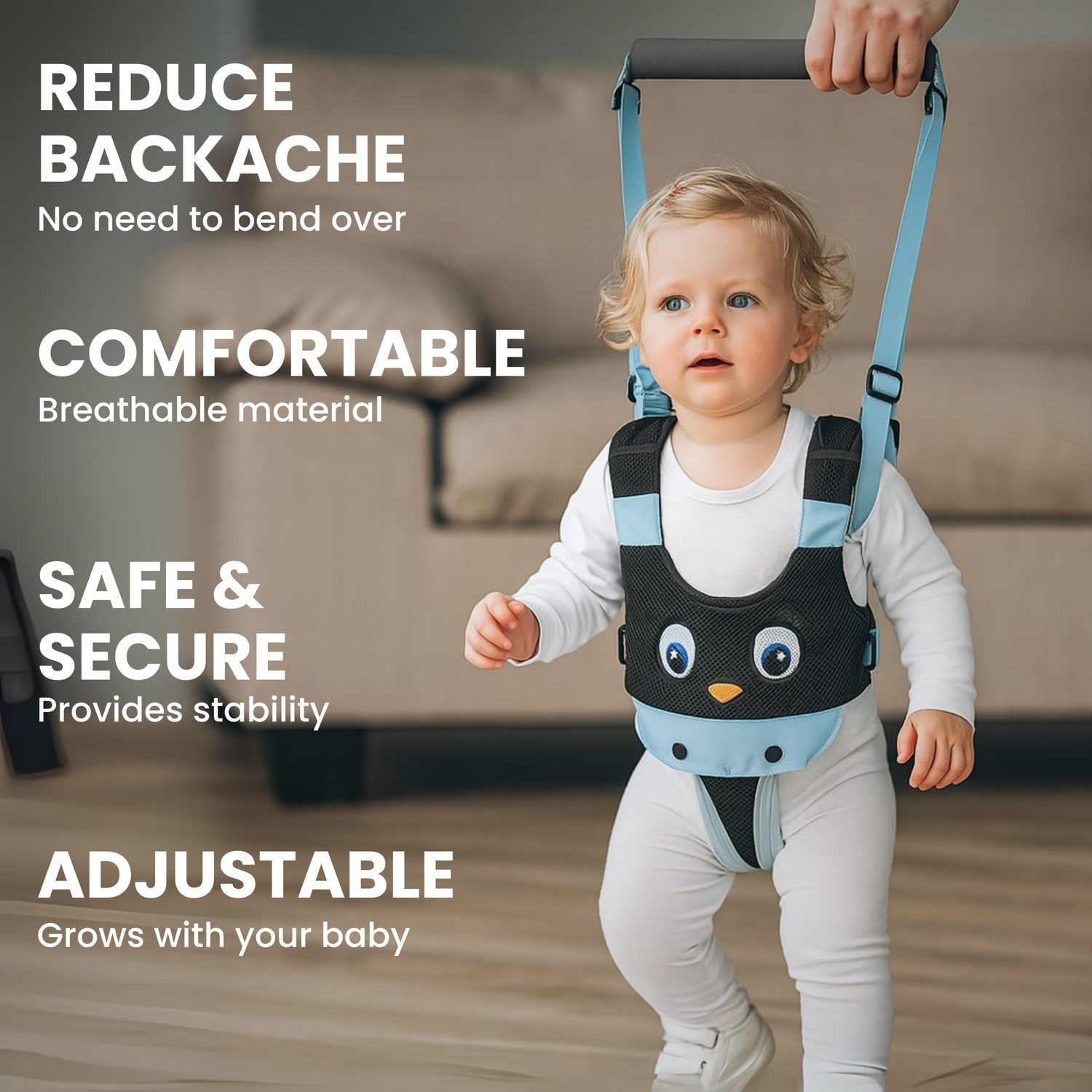 Bent over and chasing wobbly steps? Our baby walking harness helps your little one learn to walk safely while saving your back from the strain. No more hunched-over hand-holding or sudden falls — just smoother steps and less stress.